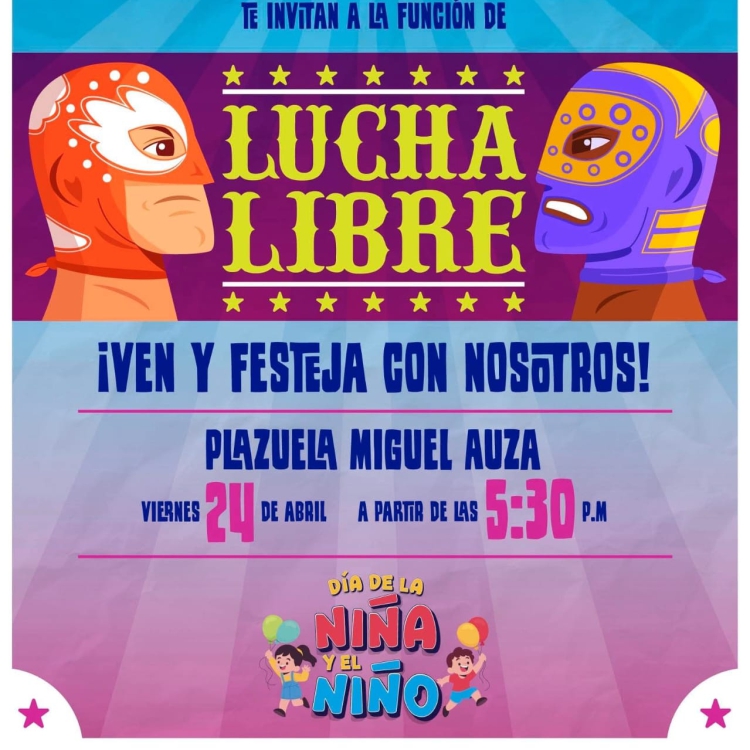 El Honorable Ayuntamiento de Zacatecas, en coordinación con el Sistema DIF Municipal, invita a las familias capitalinas a disfrutar de una emocionante función de lucha libre con motivo del Día de la Niña y el Niño, en un ambiente lleno de diversión, convivencia y sano esparcimiento.