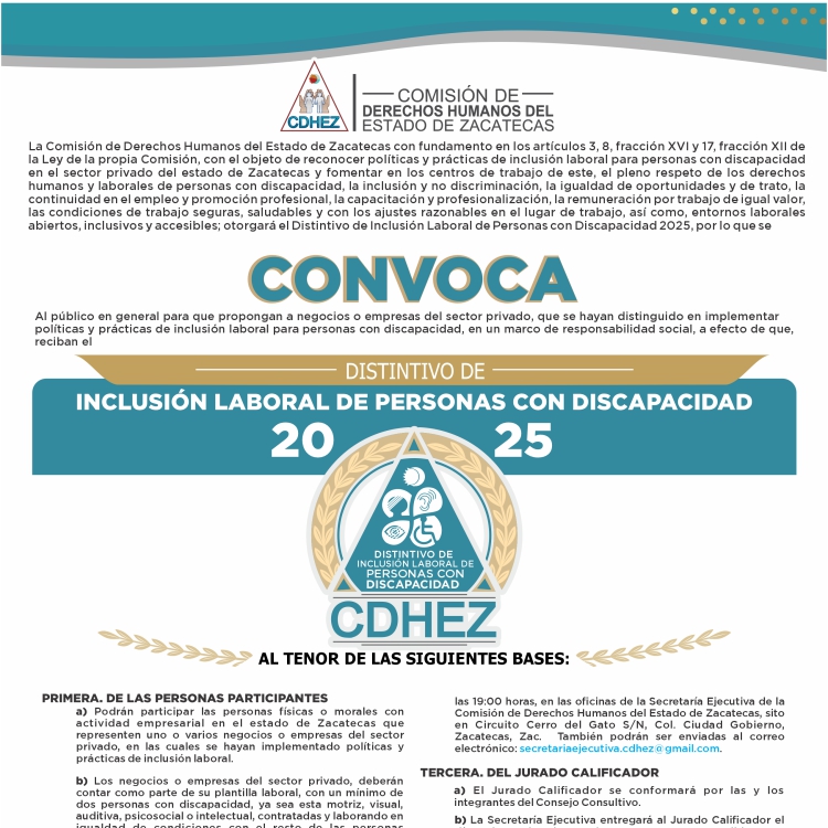 La Comisión de Derechos Humanos del Estado de Zacatecas (CDHEZ), a través de su Presidenta, Dra. Maricela Dimas Reveles, invita al público en general a proponer a negocios y empresas del sector privado que destaquen por sus políticas y prácticas de inclusión laboral de personas con discapacidad, para que participen en la edición 2025 del Distintivo de Inclusión Laboral de Personas con Discapacidad.