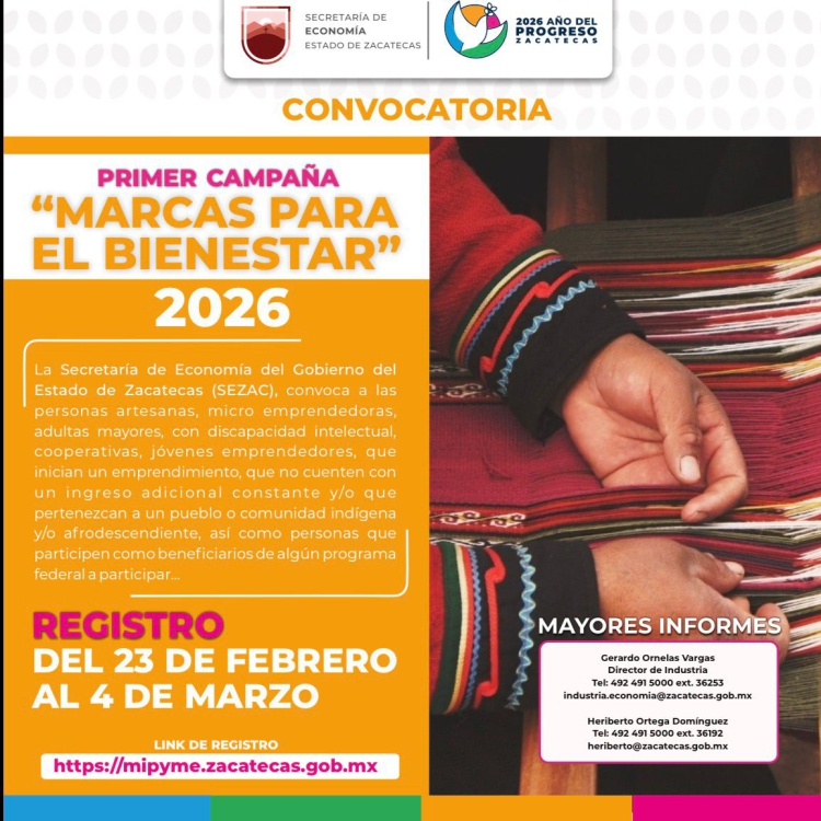 - Las y los interesados pueden inscribirse hasta el 4 de marzo, a través de la plataforma MiPyme: https://mipyme.zacatecas.gob.mx/