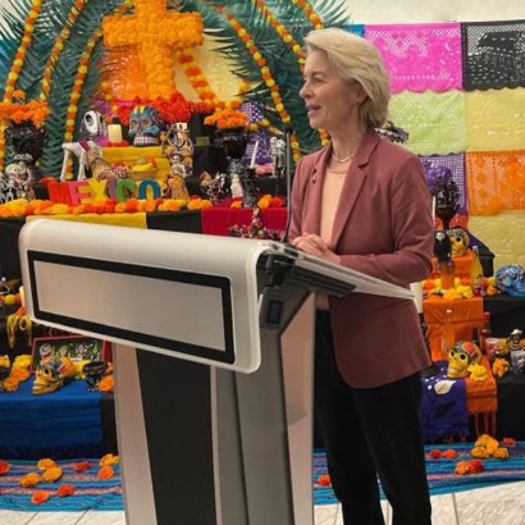 Úrsula van der Leyden cerró su discurso con un emotivo grito de |Viva México! Que dio pauta a la entrada de un conjunto de mariachis que entonaron piezas tradicionales, en tanto legisladores, embajadores e invitados admiraban el Altar de Muertos ubicado en el vestíbulo del imponente edificio parlamentario.