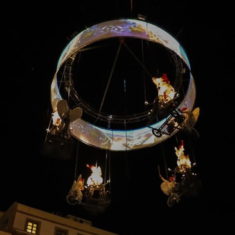 En “Pedaleando hacia el Cielo”, los ángeles suspendidos en bicicletas aéreas relataron, a los miles congregados en Plaza de Armas, una historia de amor que desafió la oscuridad y la tristeza, y que elevó al público la fuerza simbólica de los sentimientos que esta noche les unieron.